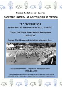 Agenda Cultural Conferências / Colóquios 23-11-2023 | 18:00 a 23-11-2023 | 19:00 INSTITUTO BARTOLOMEU DE GUSMÃO – 71.ª CONFERÊNCIA: CRIAÇÃO DAS TROPAS PARAQUEDISTAS PORTUGUESAS, 1951-1958 programa Deixe um comentário Cancelar resposta Guardar o meu nome, email e site neste navegador para a próxima vez que eu comentar. Send Comment